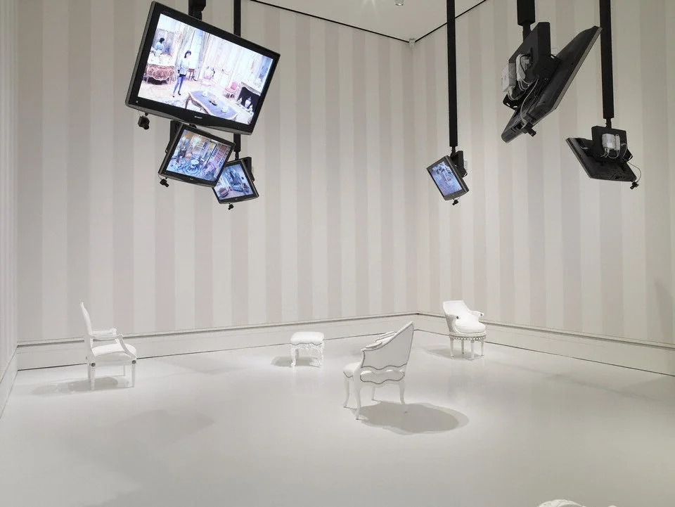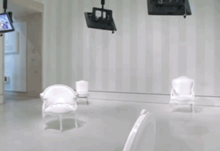 The installation blends footage from decorative arts galleries in the Getty Museum and three French museums with live video captured by a surveillance camera. As you sit in reproductions of the original chairs, you become part of the installation, virtually entering historic recreations of 18th-century French spaces. With this installation Cohen compresses time and space to create a metaphorical game of musical chairs.
